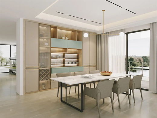 餐邊柜補(bǔ)充整體空間的儲(chǔ)物需求,解放桌面空間。除掩門(mén)收納外,餐邊柜開(kāi)放式設(shè)計(jì)與玻璃掩門(mén)的組合,讓收納同時(shí)具備收藏展示功能。
