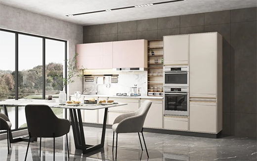 櫥柜更注重空間布局與使用功能的完美結(jié)合,電器選擇嵌入式的設(shè)計(jì),視覺(jué)更具統(tǒng)一性,整體感也更強(qiáng)。門(mén)板粉色系的加入,賦予空間靈動(dòng)活力,整體是不具沖突的美感,是沉穩(wěn)的高級(jí)感。