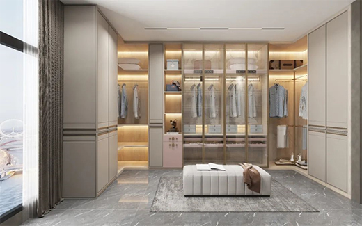 衣帽間整體以U字型設(shè)計(jì),木質(zhì)掩門(mén)、玻璃柜門(mén)、開(kāi)放式收納在這個(gè)空間達(dá)到一種舒適的平衡,實(shí)用同時(shí)兼顧展示效果。