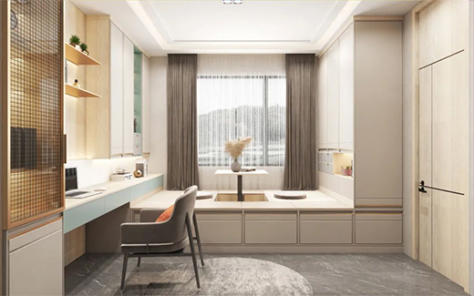 榻榻米空間加入升降臺(tái)功能設(shè)計(jì),讓客臥兼具客廳待客這一功能,滿足休閑洽談、睡眠、儲(chǔ)物等多個(gè)功能,完美體現(xiàn)定制帶來(lái)的高效空間利用率。