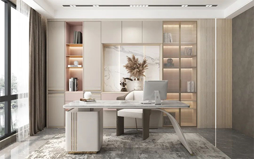 書(shū)房以溫和的木紋,恰到好處的莫蘭迪灰粉,再搭配精簡(jiǎn)的爵士白,簡(jiǎn)致而不失溫情。右側(cè)的玻璃高柜,提高空間整體高級(jí)感,打造適合辦公思考的環(huán)境,營(yíng)造極佳的閱讀、辦公、學(xué)習(xí)氛圍。