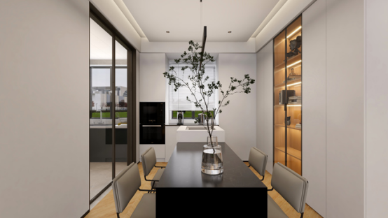 餐廳與廚房,通過玻璃移門分隔兩邊