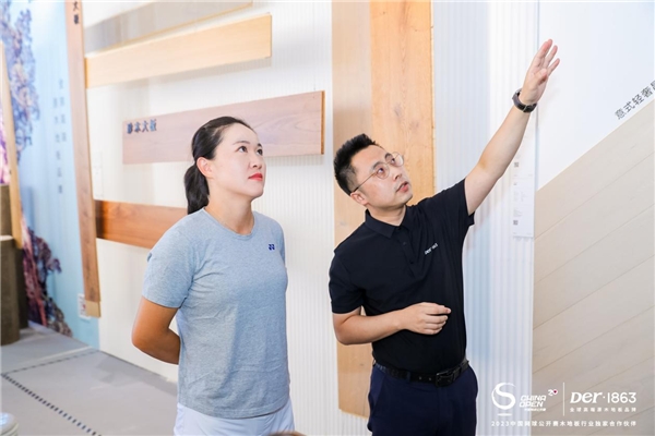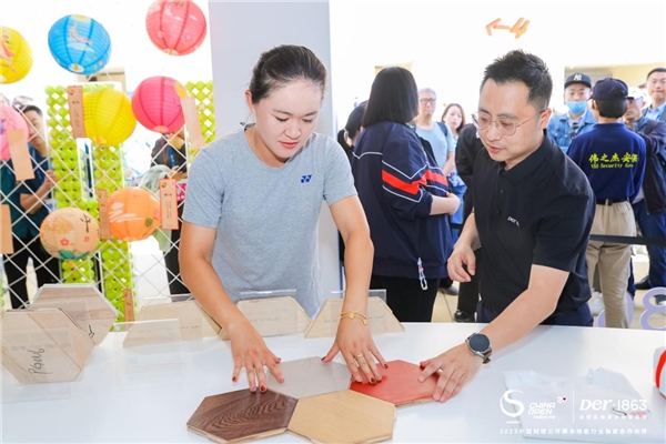 球員活動(dòng)當(dāng)天,Der·1863事業(yè)部總經(jīng)理董瑩先生與朱琳一同參觀品牌展區(qū),從品牌理念到產(chǎn)品內(nèi)涵,董瑩先生帶領(lǐng)朱琳參觀了Der·1863王牌產(chǎn)品的特色之處,講述品牌與中網(wǎng)合作的初衷,并重點(diǎn)介紹了本次中網(wǎng)指定木地板產(chǎn)品“和風(fēng)朗月”系列。
