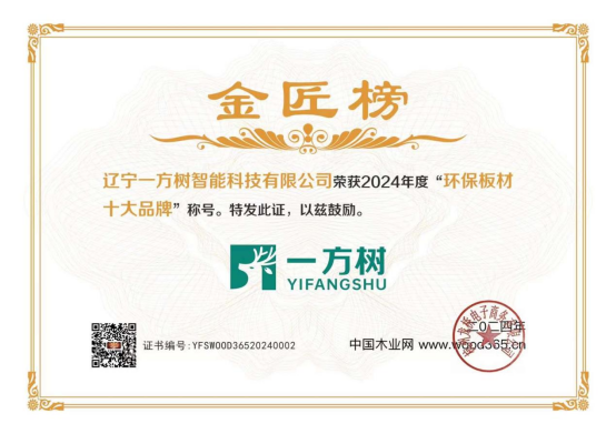 喜訊!一方樹家居斬獲金匠榜2024“環(huán)保板材十大品牌”榮譽