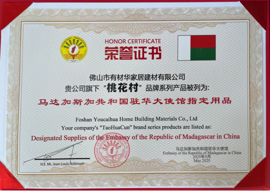 近日,佛山市有材華家居建材有限公司旗下“桃花村”品牌系列產(chǎn)品正式被列為“馬達(dá)加斯加共和國(guó)”駐華大使館指定用品,以東方匠心贏得國(guó)際認(rèn)可。