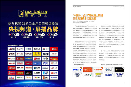 路航衛(wèi)士汽車照明乘著《環(huán)球人物》的東風(fēng),將到達更多的省市、打動更多消費者的心,進而取得產(chǎn)品推廣、市場營銷、品牌升級等方面的飛躍性進步。同時,因目標消費者范圍的擴大及忠實消費者的增加,為經(jīng)銷商打開市場奠定了堅實的受眾基礎(chǔ)。再則,各位路航衛(wèi)士人也將在《環(huán)球人物》權(quán)威雜志及社會各界的肯定下,不斷獲得工作奮斗的動力,繼而實現(xiàn)更高的事業(yè)價值。