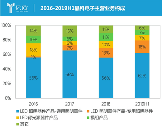 晶科電子自身業(yè)績也受到?jīng)_擊。其2018年營業(yè)收入同比僅增長2.2%,遠(yuǎn)低于前一年的49.5%;2019年上半年營收為4.19億元,同比下滑6.75%,業(yè)績承壓。從主營業(yè)務(wù)收入構(gòu)成來看,其通用照明器件業(yè)務(wù)在2018年不管是營收規(guī)模還是業(yè)務(wù)占比都出現(xiàn)明顯下滑。