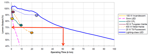 所有的傳統(tǒng)光源的性能都會隨著時間的推移而退化(輸出流明值降低),即使是LED也是如此。傳統(tǒng)光源的失效,往往是因為燈絲工作一段時間后開路而導(dǎo)致不能再使用;而LED在驅(qū)動設(shè)計合理的條件下(恒流驅(qū)動),退化非常緩慢,使用壽命遠遠大于傳統(tǒng)光源。