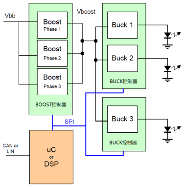 LED工作過程中,發(fā)熱量大,溫度影響著它的各個參數(shù),這就要求LED驅(qū)動應(yīng)該使用恒流源。實際應(yīng)用中,不同的LED有著不同的參數(shù),再加上不同照明方式的設(shè)計要求,很難找到一個通用的設(shè)計方案去匹配。安森美為車用大電流的LED驅(qū)動提供完整的解決方案,使用的是BOOST-BUCK的拓撲,并且各器件參數(shù)均可通過編程配置,如圖 2所示,先升壓后降壓,可滿足各種不用應(yīng)用的設(shè)計,特別是汽車前照燈方面。