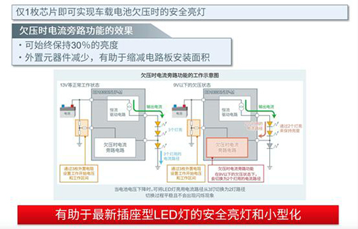 葛家明進(jìn)一步解釋了該芯片的工作原理:其與外圍3枚電阻去配置來監(jiān)測電池電壓,當(dāng)車載電池電壓向下跌落,比如說進(jìn)入9V以下這個欠壓狀態(tài)時,芯片可以去旁路負(fù)載中最下面一顆LED,保證剩余的2顆LED燈達(dá)到期望的亮度。并且,從3顆燈點亮到欠壓狀態(tài)下2顆燈點亮,切換會是平滑平穩(wěn)的一個過程,不會出現(xiàn)閃爍。