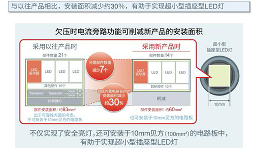 以往的產(chǎn)品如果要實現(xiàn)欠壓工況下電流旁路功能,除了常規(guī)搭載的線性LED驅(qū)動器以外,還需要額外在PCB板上配置一些分立的元器件,這樣總的元器件數(shù)目會達(dá)到21個,總的PCB板安裝面積為83平方毫米。葛家明做了個對比:“采用BD18336NUF-M以后,總元器件數(shù)目可以減少7個,總的安裝面積可以控制在60平方毫米之內(nèi),比以往的設(shè)計方案節(jié)約了30%的安裝面積,很容易安裝在10mm×10mm插座型很細(xì)小的PCB板上?!?/p>