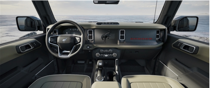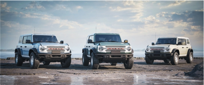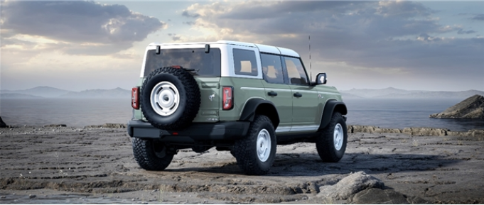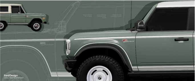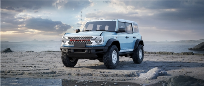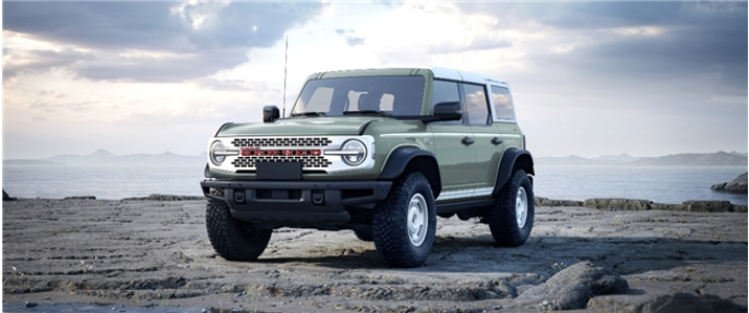 作為以獨(dú)特方式紀(jì)念原始設(shè)計(jì)的點(diǎn)睛之筆,車輛前翼子板兩側(cè)特別鑲嵌著初代復(fù)刻“Bronco”傳奇徽標(biāo),原版斜體鍍鉻樣式,強(qiáng)調(diào)出品牌的卓越品質(zhì),亦致敬福特烈馬不朽傳奇。