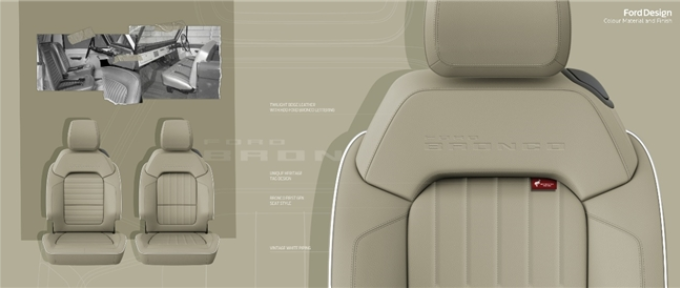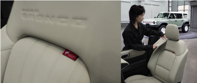 座椅的設(shè)計(jì)靈感源自初代福特烈馬,采用了垂直絎縫工藝,并在座椅邊緣使用定制牛津白(Oxford White)皮料緄邊包覆,營(yíng)造出濃郁的復(fù)古氣息。座椅上一枚定制紅色刺繡標(biāo)牌,更添手工定制般的細(xì)膩質(zhì)感,彰顯對(duì)工藝的執(zhí)著和匠心承諾。