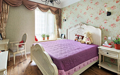 美式田園風格又被稱為美式鄉(xiāng)村風格,屬于自然風格的一支,倡導“回歸自然”,田園風格在美學上推崇自然、結(jié)合自然,這張臥室木地板圖片中,碎花壁紙和條紋床品、棕色木地板表現(xiàn)出悠閑、舒暢、自然的田園生活情趣。