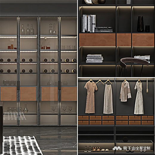 簡約實用的深色開放式鋁木衣柜,搭配橙色皮紋抽盒,為整體添加一抹亮色。超高門板采用當前市場流行的準分子材料,整體封閉與開放結(jié)合,既方便收納也便于展示。