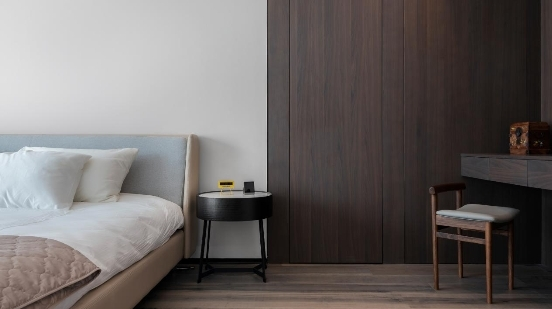 主臥中一把木椅和貼墻安裝的木質(zhì)臺面,古樸且實用,節(jié)省了空間占用面積,行動坐臥之外留白的空間也有助于情緒的自然釋放。