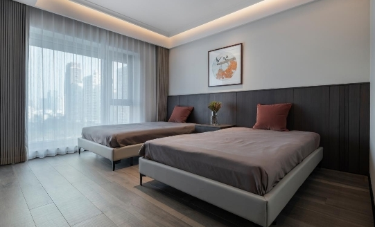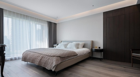 臥室的場景設(shè)計關(guān)乎主人是否能完全卸下疲憊、充分養(yǎng)精蓄銳,本案中臥室延續(xù)了玄關(guān)、客廳的整體色彩搭配和氛圍營造,從提高利用率的角度出發(fā),床榻兩側(cè),除了輕便的小桌,并未擺放其他家具或物件,以形的消減擴充主人內(nèi)心的充盈,加上純凈的吊頂搭配一圈漫射的柔光,疏放無拘的體驗也給睡眠帶來極大利好。