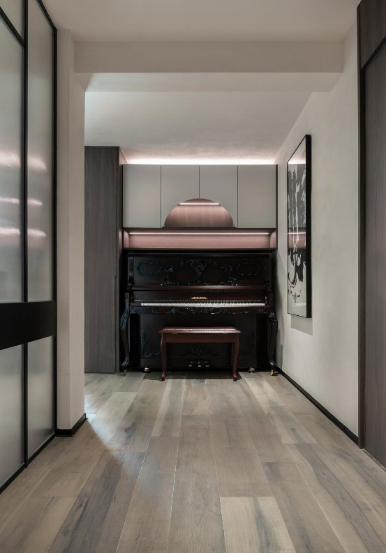 室內(nèi)通道盡處擺放黑色復(fù)古式鋼琴,給主人的情緒抒發(fā)提供了絕佳的精神場域。樂句是樂曲的呼吸,樂章是涌動生命感悟與性感節(jié)奏的贊歌,指尖音符跳躍,敬禮生活更致敬藝術(shù)。