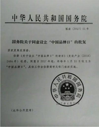 5月2日,國務(wù)院辦公廳批復(fù)同意設(shè)立“中國品牌日”。批復(fù)稱,同意自2017年起,將每年5月10日設(shè)立為“中國品牌日”,具體工作由國家發(fā)改委等有關(guān)部門組織實施。品牌日的設(shè)立,對于所有的中國品牌而言,將具有非同凡響、甚至是劃時代的意義。