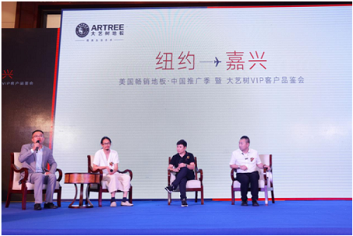 簽約儀式后,現(xiàn)場舉辦了一場精彩的嘉賓論壇。大藝樹邀請到了嘉興市家居裝飾裝修協(xié)會秘書長陸明強先生、嘉興星藝裝飾總經(jīng)理周雪輝先生、嘉興紅星美凱龍商場總經(jīng)理吳向標先生,共同上臺就大藝樹地板的產(chǎn)品風格、及當下的家裝趨勢進行了深入的交流。