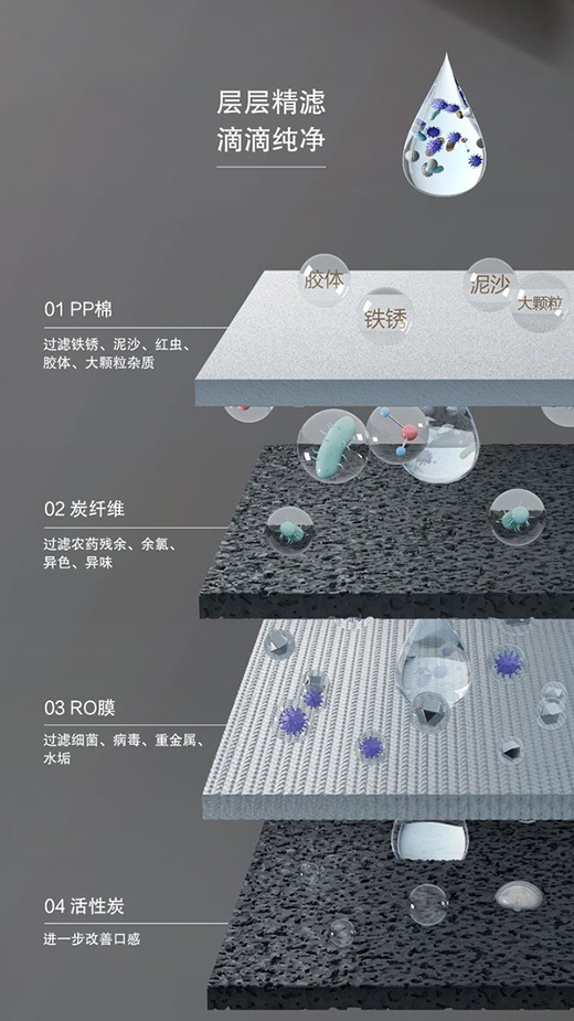 凈水,濾芯是重中之重。新品采用雙濾芯結(jié)構(gòu),雙重保證飲用水的純凈:原裝進口的杜邦反滲透濾芯,能夠有效去除水中重金屬、細菌、病毒等有害物質(zhì),凈化效果可達0.0001微米;多合一復合濾芯,集成PP棉、炭纖維、活性炭棒,實現(xiàn)三層凈化,重金屬、揮發(fā)性有機物的去除率可高達99.9%。雙濾芯相互配合,以四層凈化的高精度過濾效果,有效回應(yīng)消費者對于飲用水的健康衛(wèi)生需求。