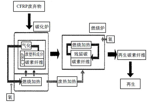 日本碳纖維再生工業(yè)公司(CFRI)創(chuàng)立的熱解法由廢CFRP回收碳纖維的獨(dú)有技術(shù),其特點(diǎn)是以廢料燃燒時(shí)所產(chǎn)生的熱分解氣作為碳纖維回收工程的熱源,從而可比以往的方法節(jié)約 6 成的能源,而所回收的碳纖維強(qiáng)度可達(dá)原生碳纖維的80%以上;再生過(guò)程是通過(guò)碳化爐和燒成爐兩段燒成而得,可原封不動(dòng)地回收長(zhǎng)纖維。該回收系統(tǒng)所回收的碳纖維產(chǎn)能約為60 t/a,目前該回收產(chǎn)品已應(yīng)用于汽車部件,可實(shí)現(xiàn)整車減重20%以上。