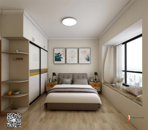 導師點評:整體風格呈現(xiàn)出溫馨、實用、休閑的室內(nèi)空間氛圍,到頂?shù)囊鹿窈娃D角的圓弧柜實用美觀,安全性能高。