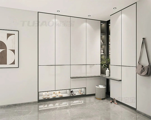 入戶空間一側(cè)是木飾面,另一側(cè)白墻+嵌入式入戶柜,其中入戶柜大面積采用白色,中間增加了灰色的隔板作為柜面,放上植物,簡單中還充滿生機(jī)。