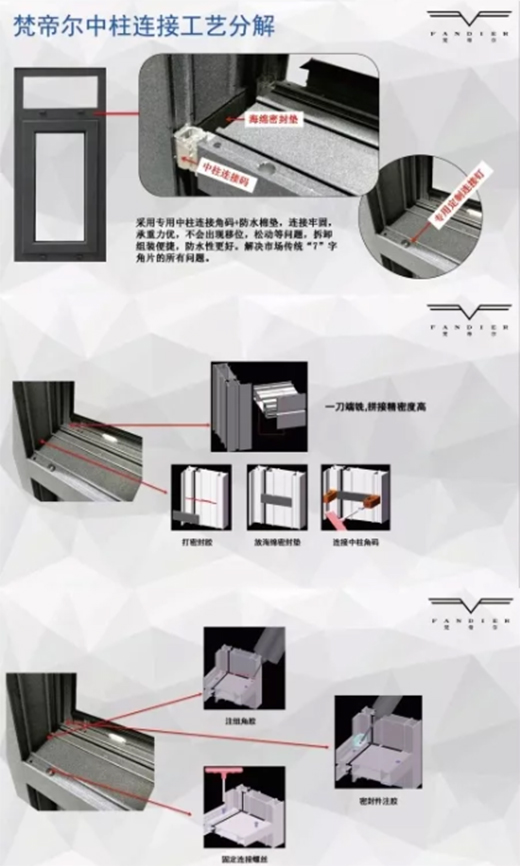 梵帝爾系統(tǒng)門窗在窗扇、窗框的四個(gè)角和中梃連接處采用專門的角碼,注入專門的組角膠,封堵縫隙。