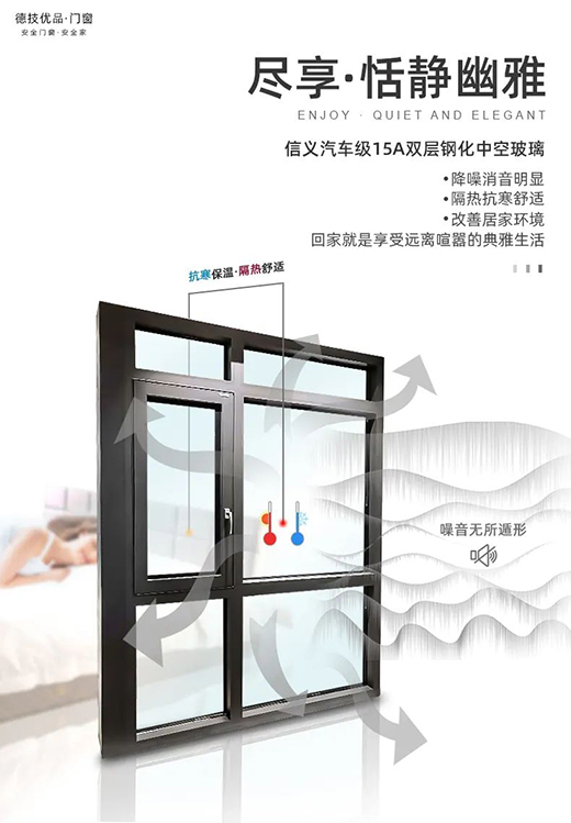 德技優(yōu)品門窗,六大核心優(yōu)勢(shì),打造安全舒適家居環(huán)境,讓您盡享舒心生活,采用信義汽車級(jí)15A雙層鋼化中空玻璃,隔音降噪,保溫隔熱再升級(jí),精湛的五金工藝,全面掌握產(chǎn)品質(zhì)量。