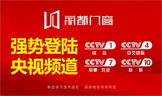 現(xiàn)今,麗都門窗的品牌廣告正在央視四大頻道火熱播出中!CCTV-1為綜合頻道,CCTV-4為中文國際頻道,CCTV-7為軍事·農(nóng)業(yè)頻道,CCTV-10為科教頻道。麗都門窗的廣告投放平臺盡可能地覆蓋到了不同階層的社會群體,可有效提高廣告的傳播范圍與傳播效果。