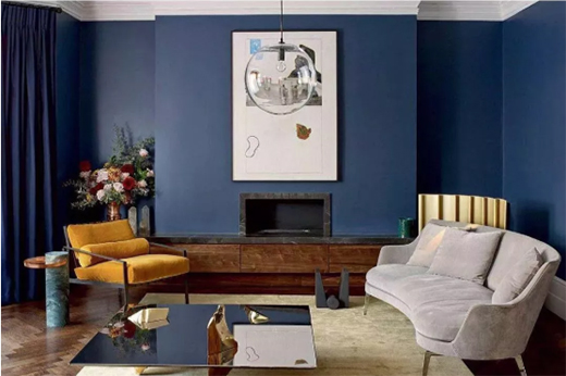 藏藍色墻面背景與窗簾搭配黃色沙發(fā),是冷靜紳士邂逅溫婉淑女,個性鮮明的色彩對接展現(xiàn)著強有力的視覺沖擊。