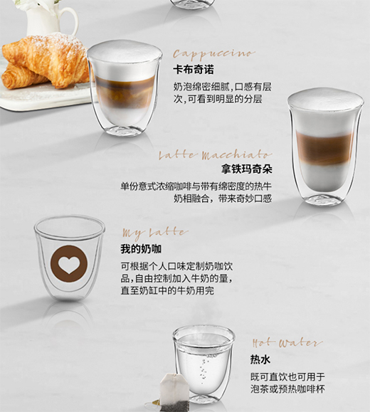 從意式濃縮咖啡、咖啡、卡布奇諾等,再到根據(jù)個(gè)人口味定制私人奶咖飲品,德龍全自動(dòng)咖啡機(jī)E LattePro和E LattePlus均能完美涵蓋以上所有需求,讓手殘黨也可以制作出美味咖啡。