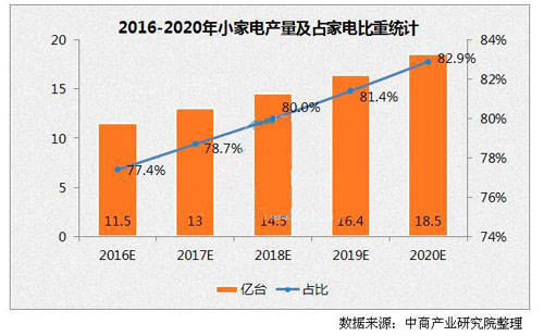 受到出口市場穩(wěn)定及中國生活水平有所改善,帶動小家電的需求等因素影響,中商產(chǎn)業(yè)研究院發(fā)布的《2016-2021年中國小家電行業(yè)研究及發(fā)展預測報告》預測,中國小家電的總產(chǎn)出量及產(chǎn)額將分別由2016年約7.6億臺及2824億元急速增加至2020年約10.86億臺及4689億元,分別以大約12.7%及13.5%的復合年增長率增長。