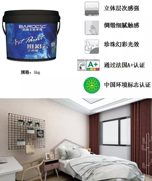 巴德士雅彩絲藝術(shù)漆是一款含有絲光纖維,并搭配幻彩珠光,營造出一種極強藝術(shù)效果的新型藝術(shù)涂料產(chǎn)品。其水性環(huán)保凈味,且具有一定彈性,經(jīng)久耐用。層次感強、效果新穎,配色豐富,適合各種風(fēng)格裝飾。
