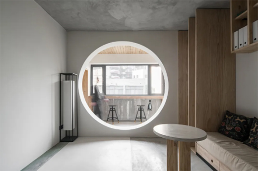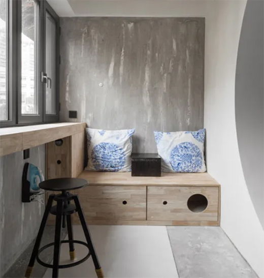 設(shè)計師在陽臺布置了休憩一角,原木和布藝的搭配賦予了空間自然愜意的氛圍感。空間中最大的亮點是藝術(shù)涂料別致的呈現(xiàn),雅致的高級灰中透露著絲絲縷縷的純白色肌理,在自然光的映襯之下充滿藝術(shù)氣息。同時沿用“天圓地方”的設(shè)計理論,抱枕、坐柜門洞的設(shè)計,都吸睛十足。