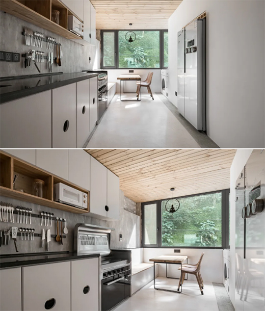廚房沿用主空間的素雅色調(diào),樸素的原木作為天花板的鋪墊,給廚房營造了溫馨自然的氛圍,而大面積窗戶的存在,則為空間注入自然的生命氣息,簡約中彰顯著高級感。