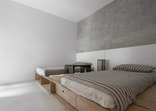 為了營造舒適宜人的休憩氛圍,設(shè)計師以灰白色調(diào)作為空間主色,大地色系的床品布置在原木床架之上,搭配復(fù)古的茶幾和燈盞,裸露的水泥墻設(shè)計與原木的溫潤質(zhì)感相得益彰,為空間注入了質(zhì)樸自然的氣息。