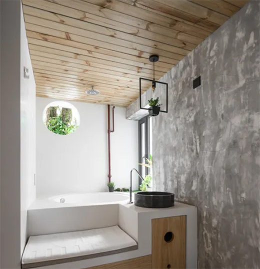浴室中綠植與原木天花板的搭配可謂獨具匠心,如此清新的神仙組合賦予了空間無限的生命力。水泥灰斑駁的藝術(shù)涂料作為墻面裝飾,別出心裁,遠超傳統(tǒng)的浴室審美。設(shè)計師的高明之處體現(xiàn)在于將日常生活和藝術(shù)審美的平衡把控,無論是整體風(fēng)格的設(shè)計還是細節(jié)的處理,都讓人拍案叫絕。