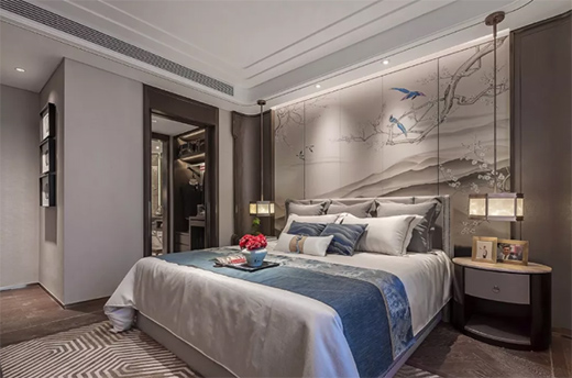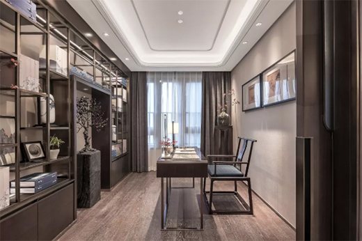 設(shè)計是人和人、人和物以及人和空間凝聚的重要媒介。一幅水墨畫,抑或是一個白瓷瓶,都能成為主人個性的延展。設(shè)計師采用高級灰咖色系為主色調(diào),緋紅、深藍(lán)為點綴色,拉絲銅、皮革、花鳥、藝術(shù)擺件等在內(nèi)的元素,讓空間營造出高雅寧靜的人文意境。主臥連通衣帽間與獨立衛(wèi)浴,龜裂的石材紋理搭暖色的中式吊燈,為主人營造私密愜意的沐浴氛圍。