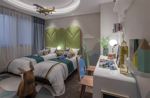 兒童房則以清新的綠色森林系主題從整個空間氛圍中跳脫出來,隨處可見的動物元素和山峰、云朵、飛機(jī)造型,為孩子構(gòu)建了一個童真童趣的空間。設(shè)計師精心設(shè)計了一體式的衣柜書桌,合理規(guī)劃了生活和學(xué)習(xí)的區(qū)域。