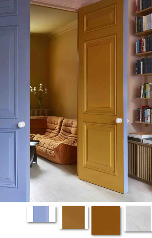 用門的色彩裝飾突出房間之間的過渡。用墻面的顏色為門和門框涂漆,在門的內(nèi)部涂上與房間裝飾韻律鮮明的對比色。