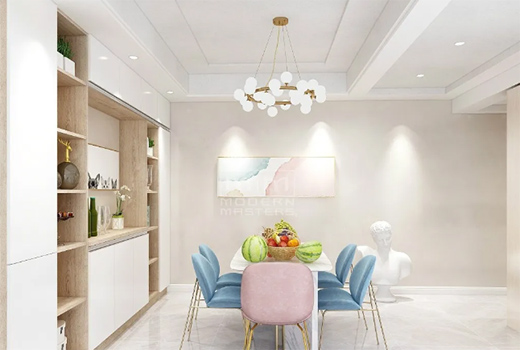 秋日私語的粉系色調(diào),營造出童話的氛圍,搭配撞色設(shè)計,讓呆板的背景墻瞬間有了立體感,既提升了墻面的藝術(shù)性,也給空間增加了浪漫的格調(diào)。