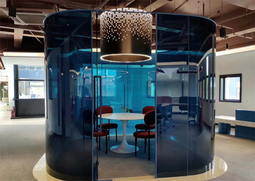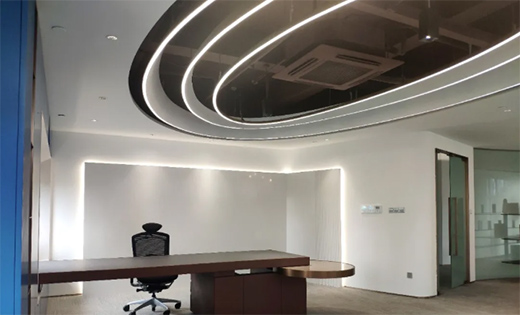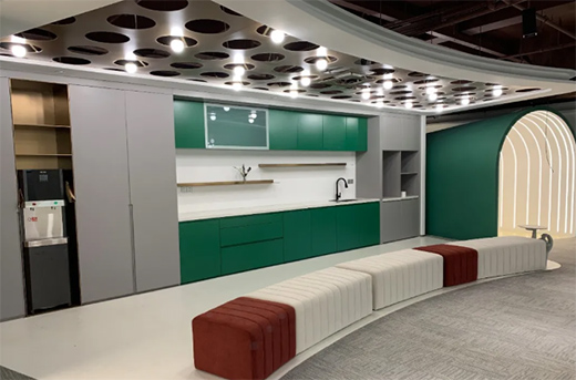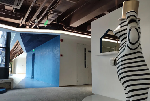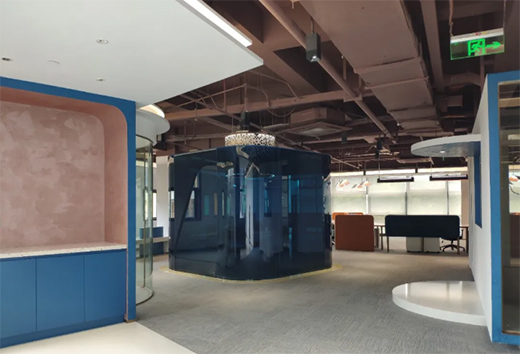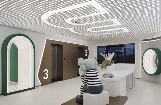 考慮到現(xiàn)場層高及現(xiàn)有的狀況,采用沖孔鋁板最大限度保障層高及采光,在軟裝上采用企業(yè)相關(guān)的動畫場景來做延伸,整個設(shè)計(jì)讓空間和光影、表皮和內(nèi)甲之間有了關(guān)聯(lián)。