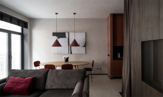 Archslon is a small apartment located in Russia. Marmorino is used as a large area of material on the wall of the whole space. The use of material is reduced to the essence, and the rhyme is not stripped away.Archslon 是位于俄羅斯的一個小型公寓,整個空間墻面以Marmorino(瑪莫瑞諾)作為大面積材料,把材質(zhì)的運(yùn)用消減到本質(zhì),不剝離它的韻,保持干凈純粹,使整個公寓充滿詩性的現(xiàn)代感!
