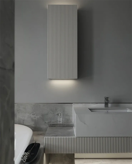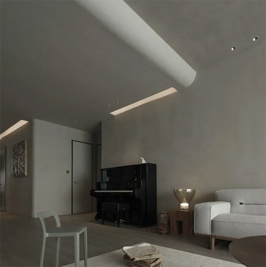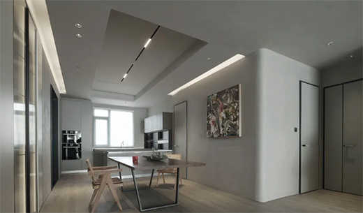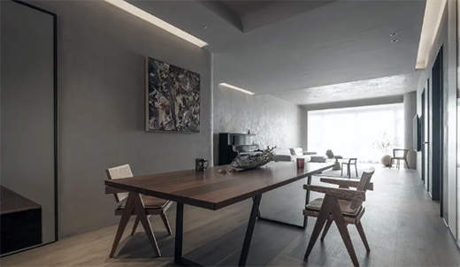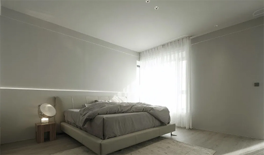 整案墻面和頂面色彩統(tǒng)一,公共區(qū)域部分采用吉納思平面瑪?shù)履a(chǎn)品,純正意大利色漿調(diào)和出的高級灰色,如同凝固的音符譜寫出寧靜質(zhì)樸的美感。臥室內(nèi)部采用單色勒文拜產(chǎn)品,啞光柔和的質(zhì)地,打造空間舒適氛圍。