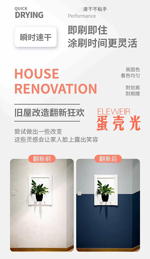 蛋殼光可大范圍適用于賓館、酒店、別墅、大型辦公樓、醫(yī)院、食品加工廠、學(xué)校等對(duì)于環(huán)境有比較高要求的場(chǎng)所。當(dāng)然也適用于住宅,如兒童房、客廳、臥室等;因其優(yōu)秀的潔凈抗污,高效防裂的能力及耐水性,也可以用于地下室,洗手間等區(qū)域。