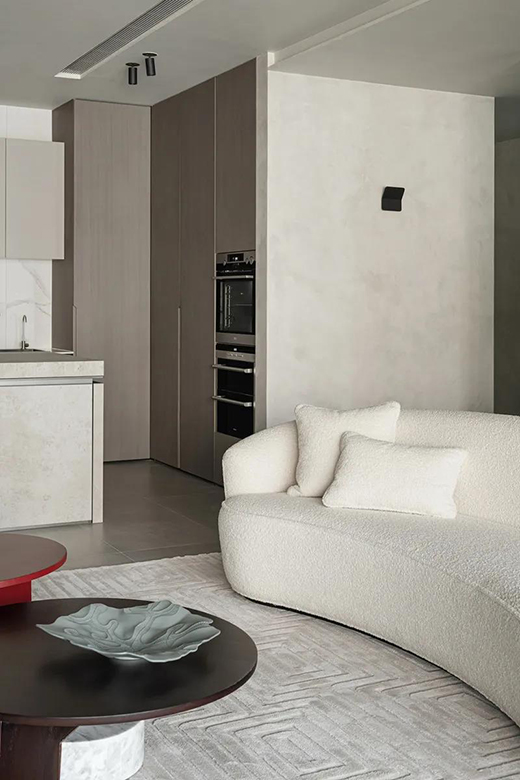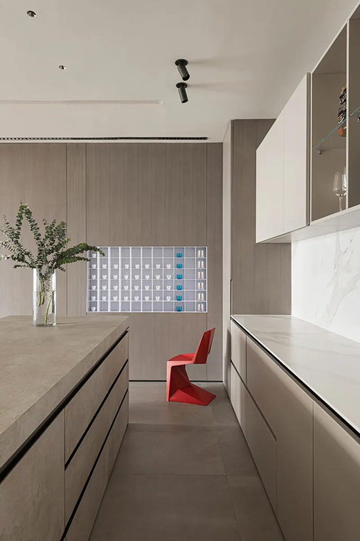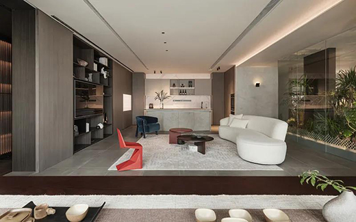 空間以中性色調(diào)為主色調(diào),設(shè)計師將客廳、餐廳、品茶區(qū)融為一體,視野得到釋放,細節(jié)經(jīng)典細致,整個空間呈現(xiàn)現(xiàn)代高級質(zhì)感和輕盈通透感。素雅的圓形茶幾顏色深暗,紅色座椅、深色及淺色沙發(fā)形成對比,構(gòu)成了顏色上的層次感,簡約而不簡單。
