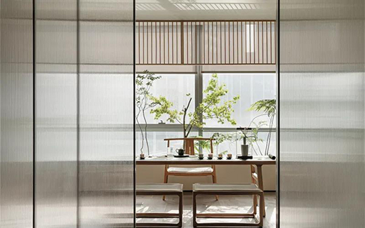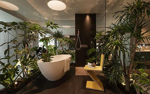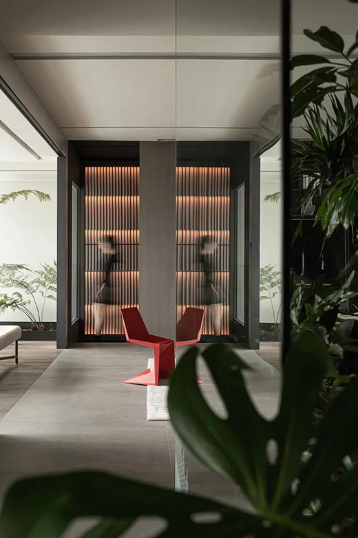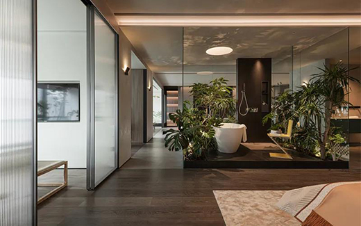 設(shè)計師非常大膽的采用透明玻璃來分隔起居室與客廳,起居室視野開闊,令人心情舒暢。而淋浴室陳列其中,春意盎然,綠植的生機則體現(xiàn)一種當下的輕盈,極大提高了生活品質(zhì)。設(shè)計師對于“空間”的構(gòu)想和創(chuàng)作非常獨特,通過玻璃材質(zhì)帶給了這個區(qū)域虛實的美感。