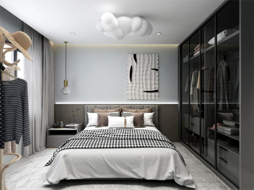 次臥設(shè)計以細節(jié)處的精雕細琢,形成了一個獨具時尚魅力的現(xiàn)代藝術(shù)空間。